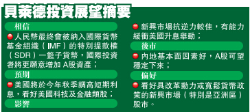 在環球貨幣政策方面,貝萊德認為,美聯儲或會在今年秋季加息,英倫銀行則有機會在今年11月或明年2月前跟隨加息;與此同時,日本及中國內地均會繼續實施趨向寬鬆貨幣政策從而刺激經濟。這些意味著,未來投資者關注焦點將由央行政策轉移至其他投資基本因素。