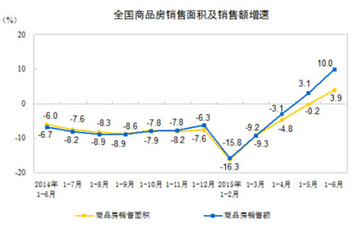 國家統計局公布的統計數據顯示,今年1-6月份,商品房銷售面積同比增長3.9%,前5個月為下降0.2%。商品房銷售額增長10.0%,增速提高6.9個百分點。其中,住宅銷售面積從前5個月的同比持平增至4.5%,銷售額增速從前5個月的5.1%提高至12.9%。
