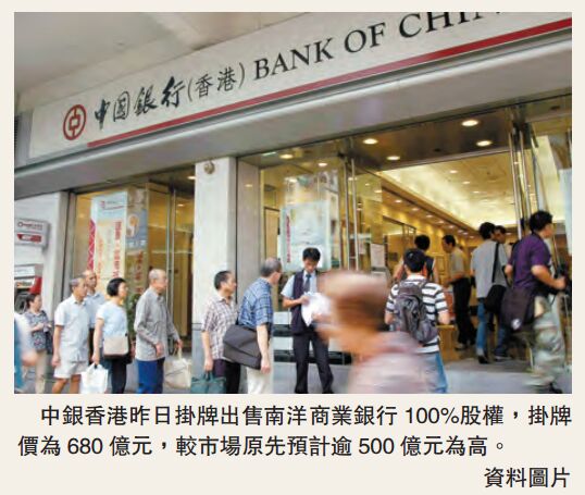 中銀香港日前獲得財政部批準出售南洋商業銀行後,昨日隨即在北京金融資產交易所掛牌,掛牌價為680億元,較截至去年底連物業估值349億元計算,市帳率(PB)約1.95倍;若較掛牌淨資產帳面價值238.34億元(人民幣,下同),即約299億港元計算,市帳率則高達2.27倍。