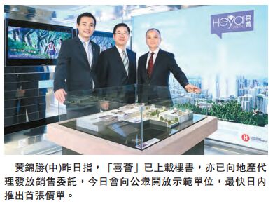 另外,同系最后一個「Heya」系列的「喜漾」,上周已獲發預售樓花同意書,項目提供275伙,位於「喜薈」旁邊。黃錦勝強調,會因應市場反應調整推盤步伐,會視乎「喜薈」的銷售情況來制訂「喜漾」的銷售部署,但未有確實推售時間表。