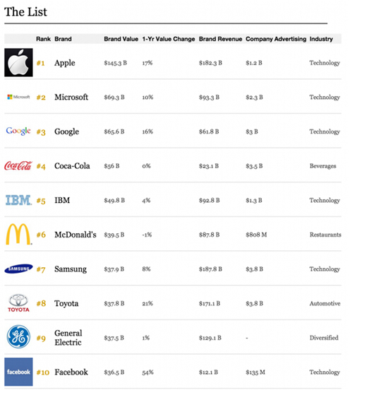 科技行業擁有非常強勁的力量,在福布斯最新評選出來的全球最具價值品牌中,蘋果、微軟、IBM、穀歌、英特爾、三星、思科、SAP、甲骨文、AT&T、Verizon等大型科技公司在前25名中占了主要地位,這些來自科技領域的公司總共貢獻了4364億美元的價值,剩下的則是一些來自食品、零售及汽車領域的公司,它們貢獻的總價值為3755億美元。