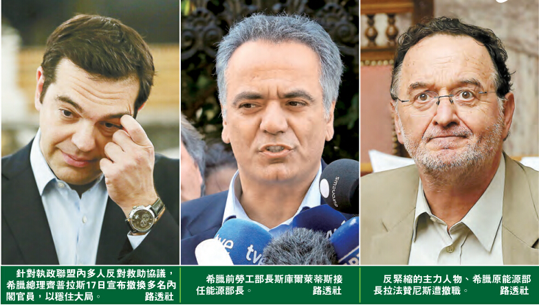 在希臘議會16日凌晨就一籃子「以改革換救助」法案進行表決時,齊普拉斯領導的激進左翼聯盟黨149名議員中有32人投了反對票,6人投了棄權票,1人缺席,這使得現政府的執政地位受到威脅。因此,齊普拉斯17日宣布撤換10名部長及副部長級內閣官員,以穩住大局。被撤換的內閣成員包括反緊縮的主力人物、希臘能源部長拉法查尼斯,其職位由前勞工部長斯庫爾萊蒂斯接任,勞工部長則由內政部主管行政改革的候補部長卡楚加洛斯擔任,吉洛瓦西里被任命為總理府副部長兼政府發言人。