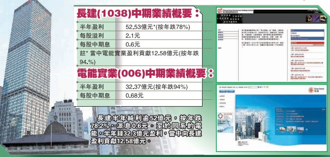 电能实业昨亦公布半年业绩,中期纯利32.37亿元,按年倒退94.2%,每股盈利1.52元,派中期息每股68仙,较去年同期微升1仙。电能实业向长建集团盈利贡献减少94%,盈利贡献只有12.58亿元。