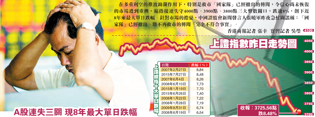 在多重利空的推波助瀾作用下,特別是救市「國家隊」已經撤出的傳聞,令信心尚未恢復的市場遭到重挫,滬指接連失守4000點、3900點、3800點三大整數關口,跌逾8%,創下近8年來最大單日跌幅。針對市場的擔憂,中國證監會新聞發言人張曉軍昨夜急忙闢謠稱:「國家隊」已經撤出、將不再救市的傳聞「完全不符合事實」。香港商報記者 張幸 實習記者 吳瑩