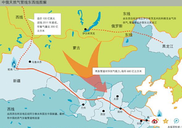 2014年11月9日,到訪的俄總統普京和中國國家主席習近平簽署了鋪設“西線”天然氣管道的框架性協議,到2020年,俄氣將向中國提供天然氣需求總量的五分之一。