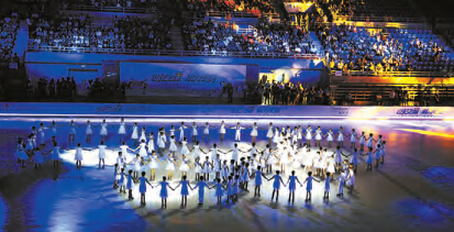 7月31日,來自北京世紀星滑冰俱樂部的小朋友擺出五環造型,慶祝申請冬奧成功。