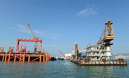 中鐵大橋局五公司的施工人員正在福建平潭海峽公鐵兩用大橋對N04主塔墩進行施工(7月29日攝)。