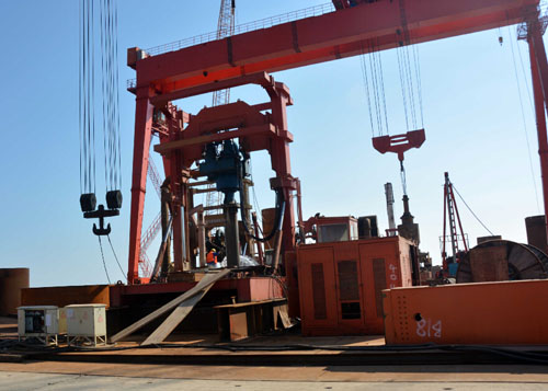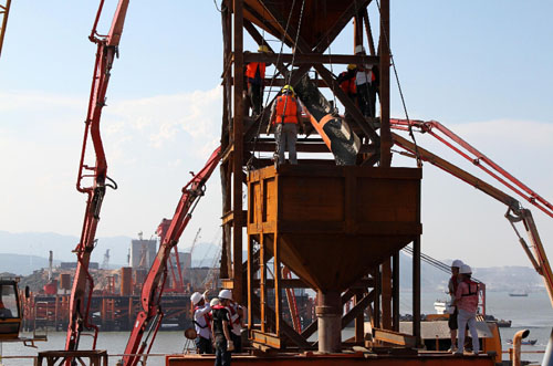 中鐵大橋局五公司的施工人員正在向福建平潭海峽公鐵兩用大橋N04主塔墩樁基灌注混凝土(8月1日攝)。