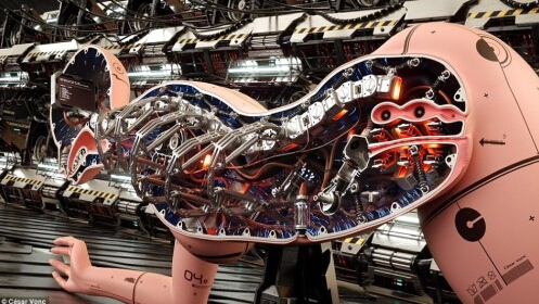 法國藝術家塞薩爾·沃克繪制了一幅令人驚異的未來派女性機器人CGI剖面圖。圖像中的女機器人擁有異常復雜的線路和電路,雖然全身上下的零部件沒有一絲生命氣息,但卻呈現出一種另類性感。在自己的網站上,沃克將這個機器人稱之為“下個世紀的新發明”。
