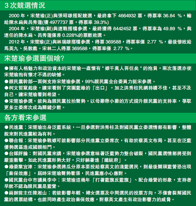 2016年,宋楚瑜再次參選,成為臺灣選舉史上角逐正副"總統"次數最多的政治人物。