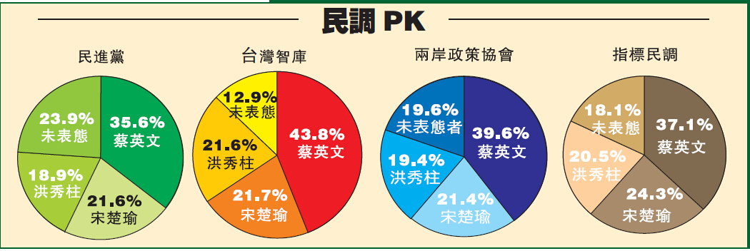 民進黨:蔡英文35.6%、宋楚瑜21.6%、洪秀柱18.9%、未表態23.9%。兩岸政策協會:蔡英文39.6%,宋楚瑜21.4%、洪秀柱19.4%,未表態者19.6%臺灣智庫:蔡的支持度為43.8%,宋為21.7%、洪秀柱21.6%、未表態12.9%指標民調:37.1%蔡英文、24.3%宋楚瑜、20.5%洪秀柱、未表態18.1%