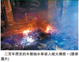 昨日凌晨1時許,村民發現長春園的后園冒烟起火,一名姓鄧村民(54歲)見狀報警,消防員接報到場開喉灌救,約10分鐘將火救熄,火警現場一部近200年歷史的古代木制水車及旁邊雜物燒毀,火場面積約4米乘4米。
