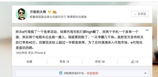 【環球科技綜合報道】今日有網友在微博爆料稱,e代駕昨天舉行的“舉杯星期三”免單活動遭到司機大量刷單,刷單占比超過50%。