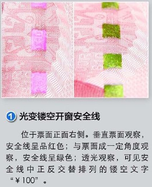 一、位於票面右側的光變鏤空開窗安全線,不同位置觀察,呈紅或綠色。