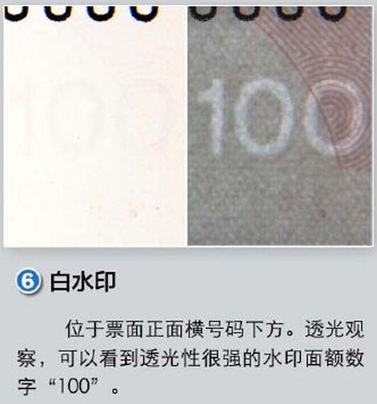 六、橫號碼下方,透光時呈現白水印數字「100」。