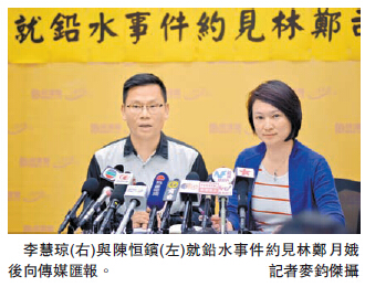 民建聯主席李慧攌及立法會議員陳恒鑌就鉛水事件,昨午約見政務司司長林鄭月娥反映訴求。李慧攌表示,自鉛水事件發生后民建聯一直關注及跟進,但對於政府宣布成立法定調查委員會至今近3個星期仍未能運作,認為需要向政府發出強烈信息。