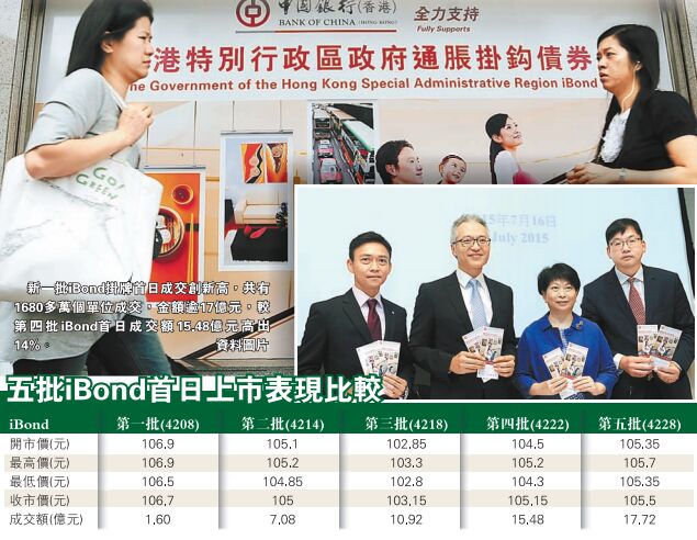 新iBond掛牌首日成交創新高,共有1680多萬個單位成交,金額逾17億元,較上一批iBond(4222)首日成交額15.48億元高出14%。有券商表示,約50%客戶選擇即日沽出iBond 5,今年較去年多了約10%至20%客人沽出,估計因本批iBond上市日價格比往年高,以及多了客人選擇短線投資所致。