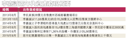 從2013年開始,李氏家族旗下的長江實業和和記黃埔就開始相繼拋售內地房地產資產。2013年8月,和黃、長實將各自所持廣州西城都薈廣場各自50%股權轉讓后,李氏家族將廣州項目作價16億元賣了出去。此后,李氏家族又出讓了上海虹口區北外灘盛邦國際、上海陸家嘴的東方匯經中心、南京國際金融中心以及北京盈科中心等項目。