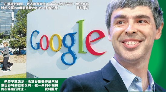 【香港商報綜合報道】谷歌(Google)在美國時間周一宣布一項全面的重組計劃。該公司將創立控股母公司Alphabet,新公司將管理谷歌旗下的各項業務。Al-phabet將由包括谷歌CEO佩奇、聯合創辦人布林以及財務總監波拉特在內的谷歌現任高層管理。新谷歌則變成Alphabet的子公司,由負責谷歌產品和平臺管理的皮查伊出任CEO。分析稱,這一新架構旨在明晰主營業務和長期投資之間的差異,因為佩奇和布林扮演越來越多戰略性的角色,而把日常運營工作交給副手。