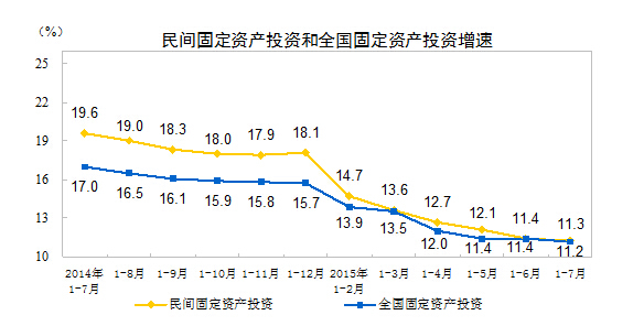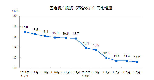 統計局數據顯示,2015年1-7月份,全國固定資產投資(不含農戶)288469億元,同比名義增長11.2%,增速比1-6月份回落0.2%,低于11.5%的預期。從環比速度看,7月份固定資產投資(不含農戶)增長0.75%。