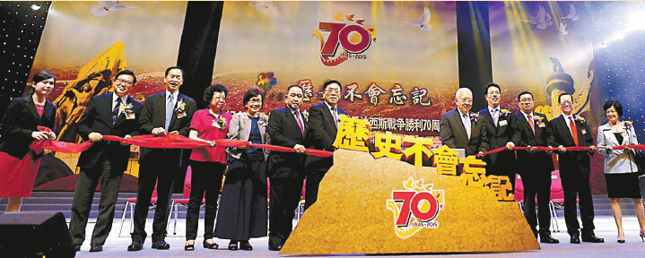 【香港商報网訊】記者李摯報道:由中國僑聯、香港僑界社團聯會主辦的「親情中華·歷史不會忘記」紀念抗戰勝利70周年大型晚會昨日假九龍灣會展中心隆重舉行。全國政協副主席董建華,中聯辦主任張曉明,中國僑聯主席林軍、副主席陳有慶,外交部駐港特派員公署副特派員宋如安,民政事務局副局長許曉暉,香港僑界社團聯會會長余國春,行政會議成員陳智思、李慧攌、葉劉淑儀、林健鋒等逾3000社會賢達出席典禮,熱鬧非常。晚會以「和平與夢想」為主題,倡導大家銘記歷史,維護和平。