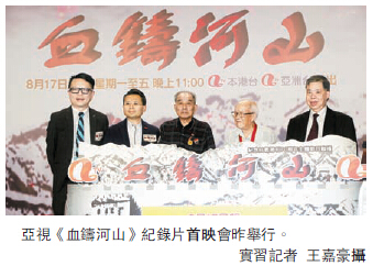 【香港商報网訊】實習記者王嘉豪報道:為紀念今年為中國人民抗日戰爭暨世界反法西斯戰爭勝利70周年,亞洲電視與內地60多個電視臺聯制聯播大型系列紀錄片《血鑄河山》,節目昨午在亞視大埔總臺舉行首映會,邀得亞視執行董事葉家寶、新界社團聯會理事長陳勇和香港各界文化促進會理事長李國強等出席。