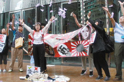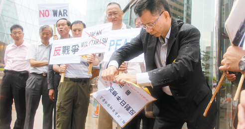 【香港商報网訊】實習記者王嘉豪報道:今天是日本戰敗投降70周年,昨日就有多個團體到日本駐港總領事館所在的大廈外請願,要求日本政府反省當年侵略歷史、恪守和平憲法、廢除新安保法案,以及正視軍票兌換和慰安婦等問題。當中有團體為表抗議,更點火燒毀日本首相安倍晉三的相片;另有團體則聲稱因總領事館「反口」,拒絕接收請願信,憤而當場將信件撕毀。