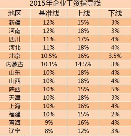 在這14個地區中,新疆、河南的基準線最高,為12%;在工資增長上線方面,天津、山西、山東、河北、河南均為18%,并列第一;而工資增長的下線,陜西最高,為5%。