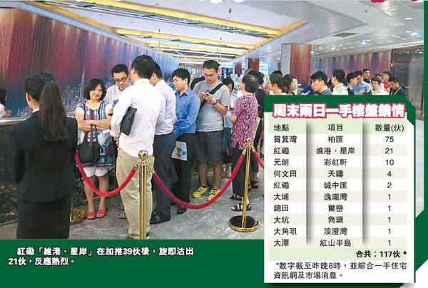 【香港商報网訊】記者鄭達偉報道:在人民幣貶值的陰霾下,令本港居民及內地客對「買樓保值」的態度更為積極。綜合一手住宅銷售資訊網及市場消息,截至昨晚8時止,過去周末兩日共錄得117宗成交,當中兩大新盤,筲箕灣「柏匯」及紅磡「維港?星岸」盡吸兩地客源,前者開賣單日已沽出首批75伙中的65伙,連同次日沽出的10伙,首批單位已悉數沽清;後者則在加推39伙後,旋即沽出21伙,反應熱烈。
