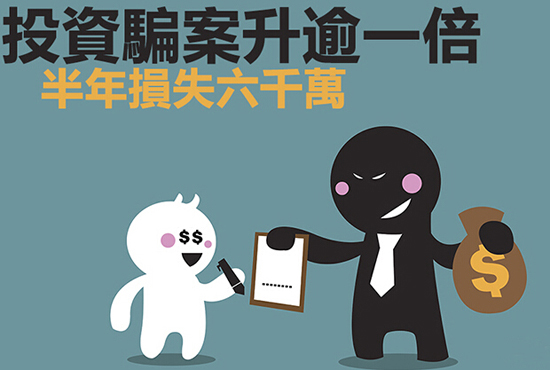 繼電話騙案肆虐,警方亦注意到投資騙案有惡化趨勢!今年上半年已錄得四宗相關騙案,達去年全年總數,涉及損失六千多萬元,按年升逾一倍。騙徒先化身自己為成功投資專家,吹噓外國產業及名人效應等,誘事主逐步墮入圈套投資巨額款項如「認購」facebook股份、「投資」美國房地產生意及中國酒廠等。