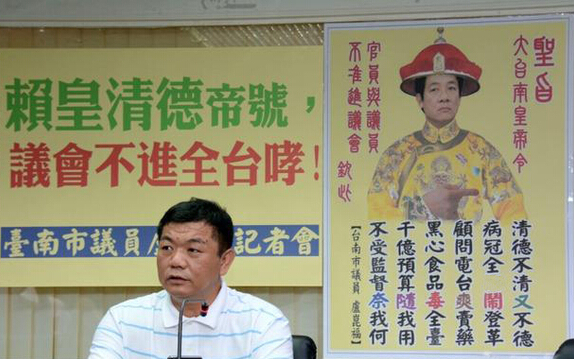 盧昆福把賴清德打造成“大臺南皇帝”,大聲朗誦圣旨:“官員與議員不準進議會欽此”,接著朗誦:“清德不清又不德病冠全臺鬧登革顧問電臺爽賣藥黑心食品毒全臺千億預算隨我用不受監督奈我何”。
