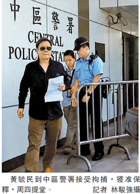 另外,激进反对派之一、独立立法会议员黄毓民,昨日亦到警署报到。他于前日获警方通知,因去年7月于立法会行政长官答问会上向行政长官梁振英投掷玻璃杯,律政司决定起诉他普通袭击一罪;他昨午5时左右到中区警署接受拘捕,获准以五百元现金保释,星期四在东区裁判法院提堂。警署外有约30位支持者叫嚣,令人侧目。