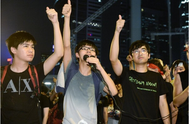 发起“占中”的香港学联前秘书长周永康(右一)、学民思潮召集人黄之锋(右二)