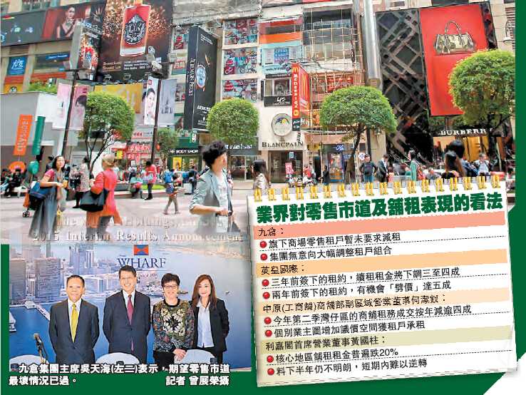 此外,市道轉差亦「打爛」發展商的「如意算盤」,更明言「打擊比預期來得快」。九龍倉集團(004)主席吳天海表示,過去11年本港零售市道暢旺,但去年下半年及今年上半年已見轉弱,變化來得比預期快,集團未能充分調整以作應對。他指出,旗下兩個商場,包括「海港城」及「時代廣場」,上半年商戶零售額分別按年跌7%及9%,多於本地整體跌幅。集團副主席李玉芳解釋指,主要由於有關零售額組合中,來自奢侈零售產品金額比例較大,惟目前暫沒有大幅調整商戶組合打算。另外,她透露目前旗下商場租戶基本租金仍呈增長趨勢,而集團亦暫未有減租壓力,當前商場及租戶更傾向以「吸引更多人流」,應對目前情況,近月集團亦已舉辦不同展覽活動,以吸引消費者。