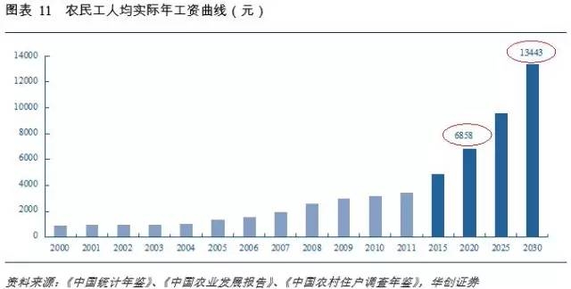 (三)不可替代性造就其收入逐年提高是一連串事件。這里的收入是廣義的收入, 除了基本的工資性收入之外,還有各項非貨幣化的福利待遇。由于農民工勞動力的不可替代性,以及該項要素本身的稀缺性,農民工外出務工的機會成本加大,導致了要素資產的價格近年的快速上漲,近兩年的工資收入增速保持在15%以上,遠高于GDP的平均增速,2011年全國外出農民工的月均工資收入2049元,比2010年增長21.2%,預計到2015年,農民工的實際工資將會達到4898元,2020年、2030年分別達到9601元和13442元;同時福利待遇也在不斷上升。