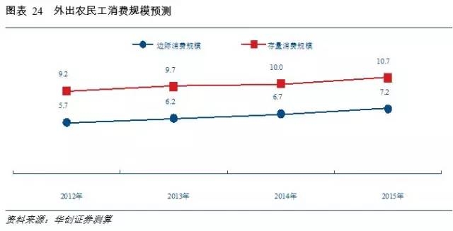 (三)消費市場2015年占比GDP至少達7.2%。基于邊際消費預測2015年外出農民工消費市場規模達到GDP的7.2%,基于存量財富的消費行為的市場規模更是達到GDP的11%。