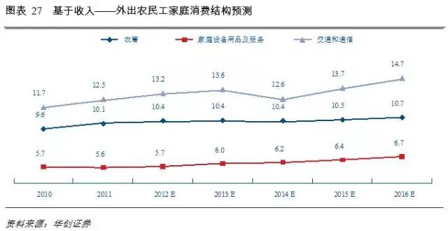華創證券分析師牛播坤,余芽芳在最新的消費系列報告中指出,隨著規模和收入的不斷增長,農民工群體正在成長為一股不容忽視的消費力量。2015年,農民工消費的市場規模將達到GDP的11%。
