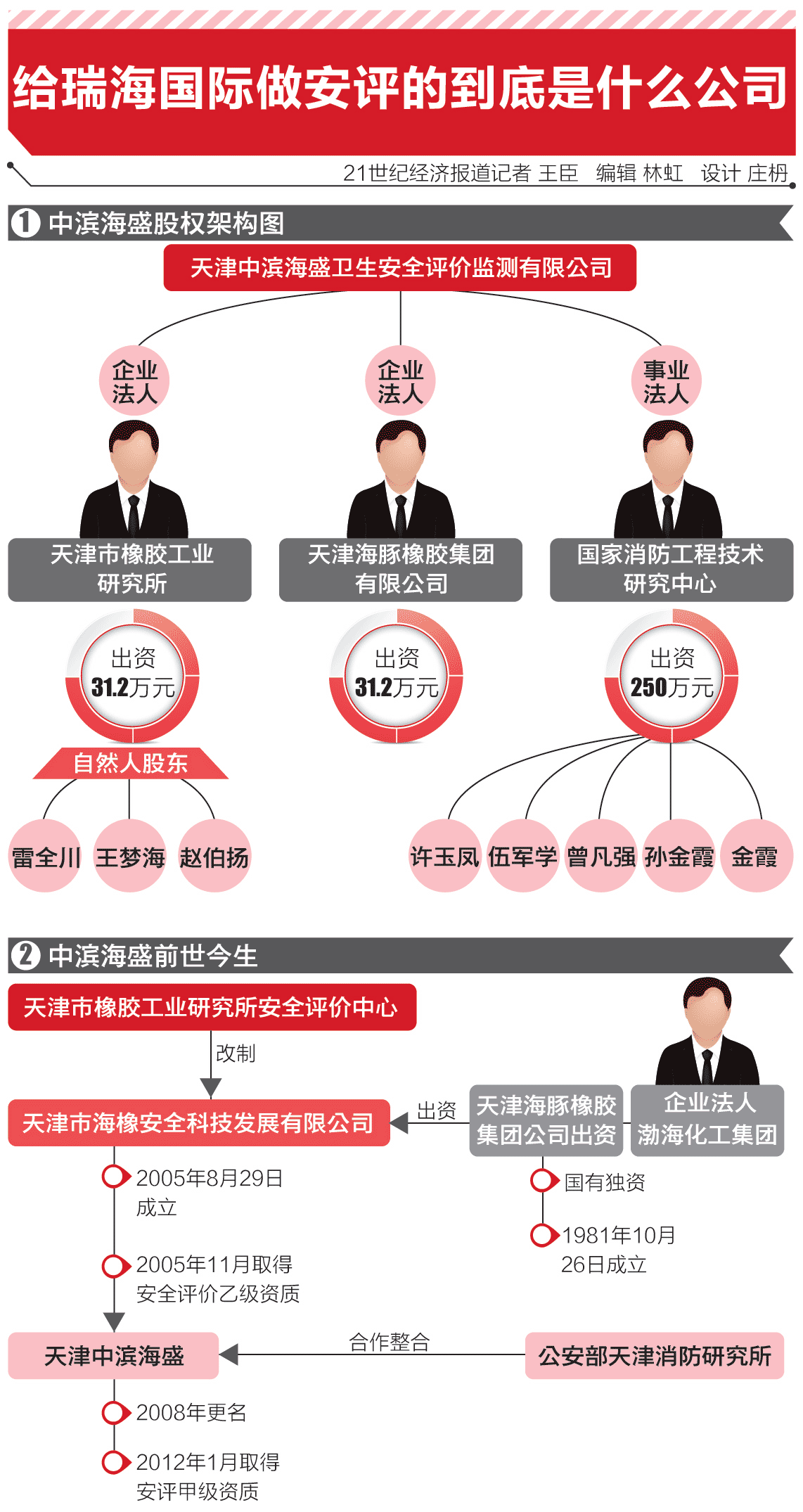 中濱海盛的前身是成立于2003年4月的天津市橡膠工業研究所安全評價中心。2005年8月29日,該中心改制,由天津海豚橡膠集團公司(以下簡稱海豚橡膠公司)與天津市橡膠工業研究所和相關自然人共同出資,組建成立了天津市海橡安全科技發展有限公司,并于同年11月取得安全評價乙級資質。