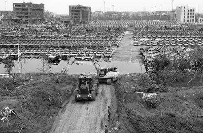 天津港爆炸事故救援部隊聯合指揮部救援人員昨日開始分組進入核心區,對現場集裝箱、化學品進行標識,清理貨物。