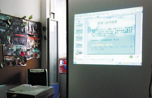 越秀区一家名为贝资的培训机构,其课室大概有60平方米,墙上贴着一些人体构造图。课室的陈设较为简单,一个小投影仪,一个小讲台,上面摆放着上课所需的器材和工具,10来张小课桌,两张供学员和讲师进行手法练习时使用的床位。