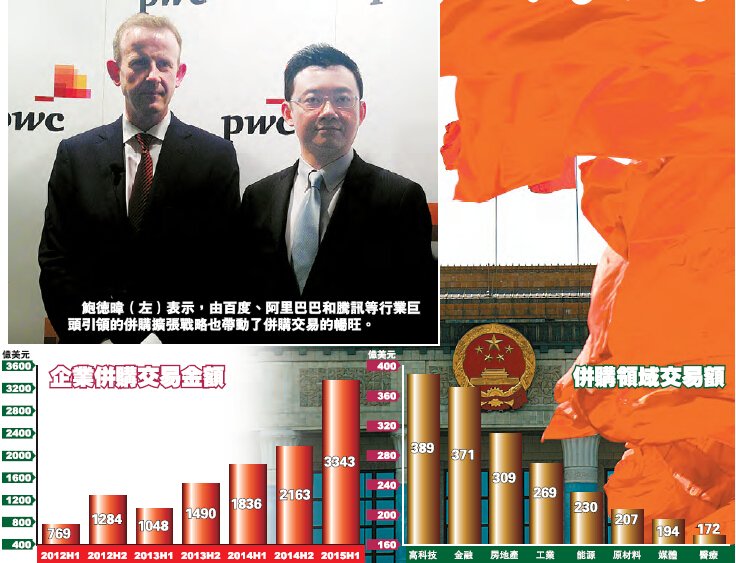 罗兵咸永道提供的数据显示,科技、金融服务和房产行业成为2015年上半年内地并购交易的重点行业。该机构企业并购服务主管合夥人鲍德暐介绍,此现象背后的推动因素包括政府推动、房地产渴求资金,以及中小企业对金融服务需求增长。