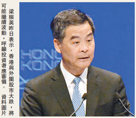 梁振英昨日行政會議前會見傳媒時表示,昨日香港與外圍股市大跌,將可能繼續波動,呼籲投資者應審慎。他強調,本港投資市場的制度、規管和監管能力都是穩定,所以他對本地投資市場有信心,但他提醒投資者要警惕近期較差的外圍實體經濟情況和投資氣氛。