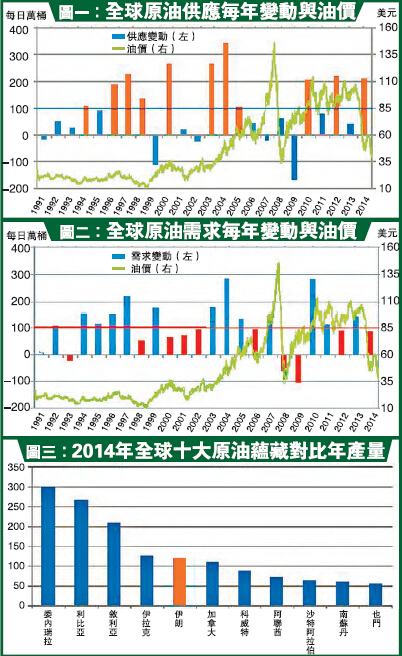 對比需求,市場更為看重需求面。圖二見到,2014年比2013年亦只增加84萬桶(紅色棒代表增幅少於100萬桶),而2013年亦只比2012年增加139萬桶,就算2007年前經濟興盛間,原油需求每年都只增加百多萬桶。同樣地,現時只是伊朗就已經能增加100萬桶,加上沙特阿拉伯及其他產油大國,需求似乎未能跟足供應增長的步伐。如斯情況下,求過於供或會逐步收窄,故現時油價又確實跌得有道理。