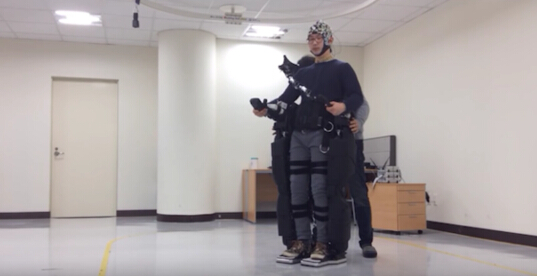 這套機器外骨骼是由德國和韓國的科研人員聯手研發的。它在設計時,很好的適配了實驗者的臀部和腿部,而其它的部分還包括一個裝滿了電子元件的頭套,通過它的幫助,就可以將實驗者的大腦同這套設備進行連接。