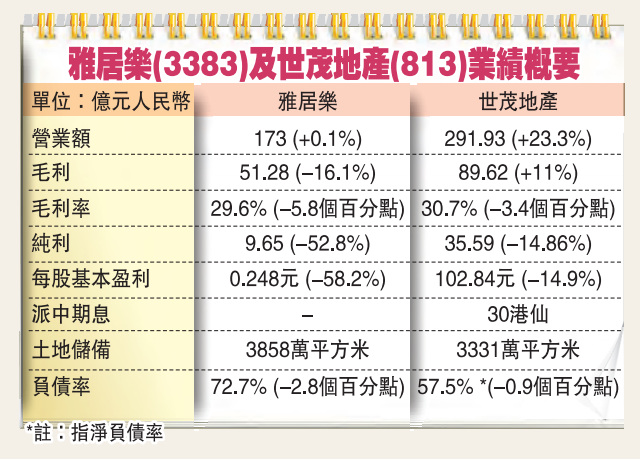 世茂地產上半年純利35.59億元(人民幣,下同),下跌14.84%,毛利額89.62億元上升11%,毛利率則由上年全年32.5%下跌至30.7%。雅居樂截至6月底核心利潤下跌50.9%至9.2億元,毛利率按年跌逾16%至51.3億元。