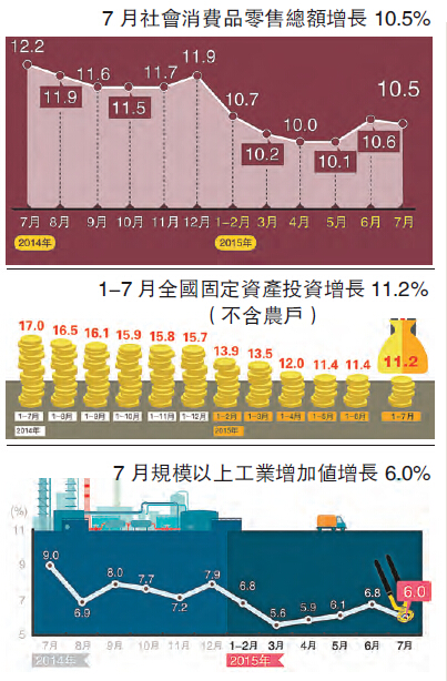 7月社會消費品零售總額同比增長10.5%,增速與上月基本持平,從貢獻率來看,今年上半年最終消費對經濟增長的貢獻率達到60%,同比提高5.7個百分點。「中國經濟發展仍有巨大潛力、巨大餘地和巨大韌性。」發改委在文中強調,目前中國經濟仍具備保持中高速增長的潛力,雖然工業生產價格持續低迷,但消費價格漲幅預計不會超過2%。文章分析認為,要理性、客觀、全面地認識經濟存在的問題,考慮到經濟政策有一定滯后性,今年以來出臺的宏觀調控政策和改革措施在下半年會繼續發揮作用。預計今年下半年,中國經濟有望保持增長態勢,全年GDP將增長7%左右,有把握實現年初確定的預期目標。