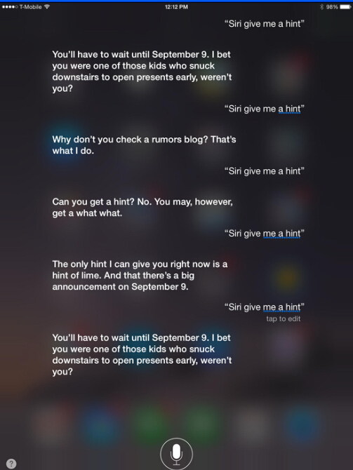更准確地說,Siri在回應這個問題時真是又萌又調皮,她會讓這些“焦急的人”耐心等到9月9日去了解一切。