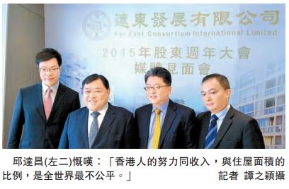 樓市與近日股市逆行其道,有升無跌。邱達昌指,「香港人喜歡要買私樓」,他預料,本港800萬元以下的單位將較受歡迎,且本港約有3至4萬人有能力負擔。他續指,由於今年樓價急升,令小型單位需求增長強勁,地產商被迫興建小型單位,他形容這是不公平的現象。邱氏慨嘆:「香港人的努力同收入,與住屋面積的比例,是全世界最不公平。」