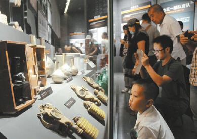 參觀者在觀看防毒面具、細菌培養箱、氨液瓶等展品。