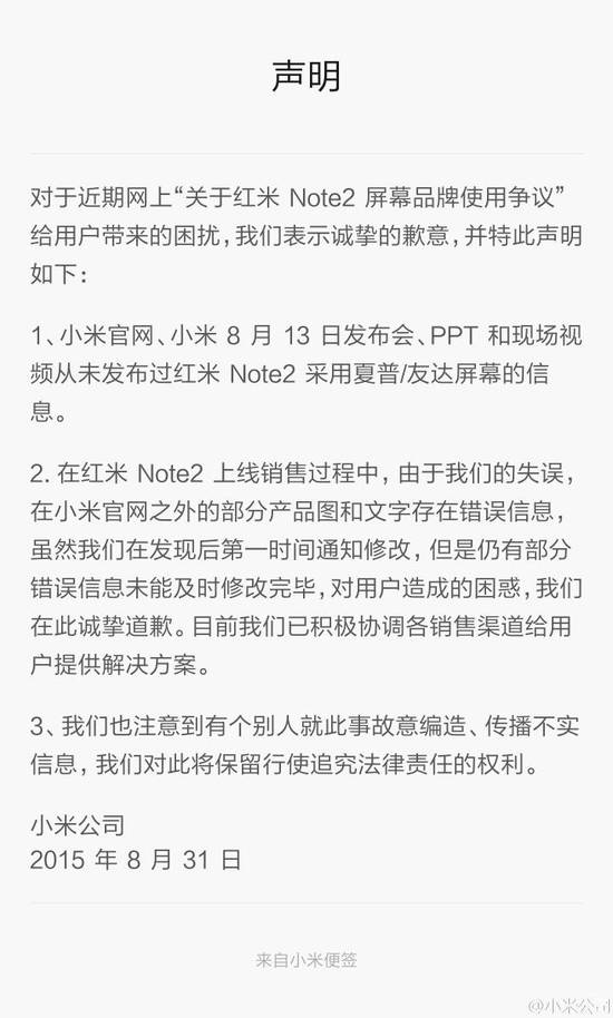 對此,小米公司發聲明稱:“小米官網、小米8月13日發布會、PPT和現場視頻從未發布過紅米Note2采用夏普/友達屏幕的信息。”但“在紅米Note2上線銷售過程中,由於我們的失誤,在小米官網之外的部分產品圖和文字存在錯誤信息……對用戶造成的困惑,我們在此誠摯道歉。目前我們已積極協調各銷售渠道給用戶提供解決方案。”